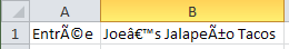 using System.IO; using System.Text; class TestEncoding { static void Main() { var encodingWithBOM = new UTF8Encoding(true); using (var writer = new StreamWriter( "menu.csv", false, encodingWithBOM)) writer.WriteLine( "Entrée,Joe’s Jalapeño Tacos"); } }Now our Excel file looks like this: Much better!